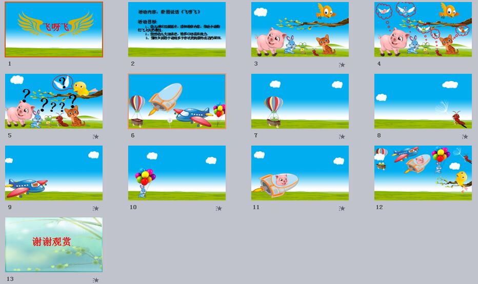 1.幼兒通過(guò)觀察圖片,感知故事內(nèi)容,體驗(yàn)小動(dòng)物們飛上天的喜悅。