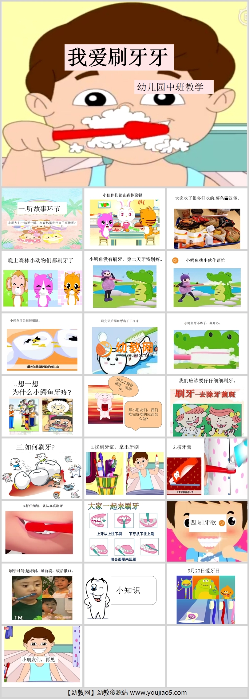 知道保護牙齒的重要性,通過歌曲學習刷牙的方法。